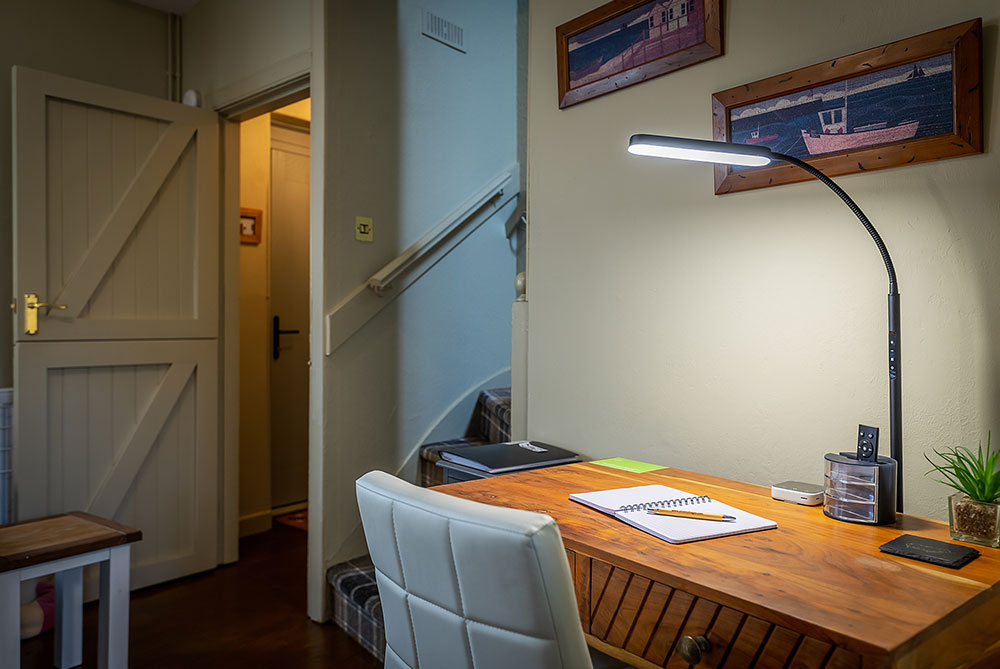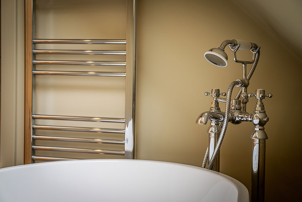 Steep cottage stairs lead up from the living room to the first floor landing. While there are handrails, guests should appreciate that the stairs are very steep and extra care should be taken. The cottage is not suitable to anyone with reduced mobility given the gradient of the staircase. Off the landing is a pretty cottage-style double bedroom plus bathroom with deep freestanding bath and handheld in bath shower attachment.