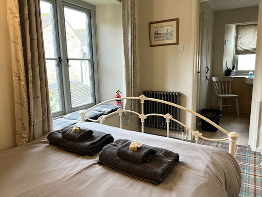 The open stairs lead up from the sitting room to a comfortable bedroom with en-suite bathroom. This lovely light and spacious room enjoys views out over garden and honey-stone roof tops. Considerately furnished with a traditional iron framed double bed and large wardrobe offering good storage, there are also personal touches that give the room its style. The adjoining bathroom is a good size and features a full size bath with shower over, WC and basin with plenty of shelf space.